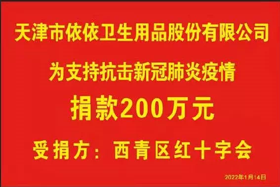为支持抗击新冠肺炎疫情向西青区红十字会捐款200万元,向西青区区政府捐赠一次性医用口罩20万个 。