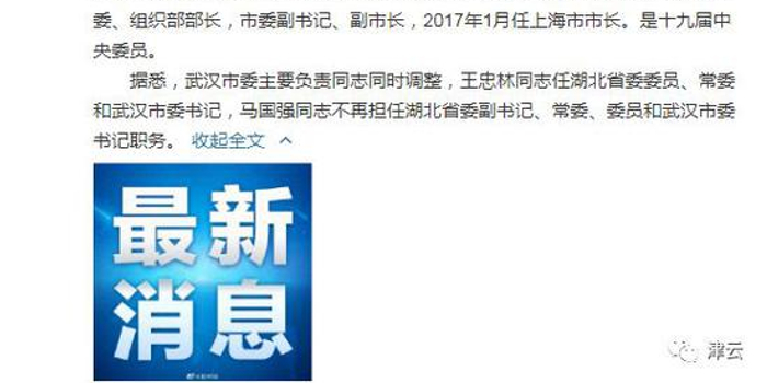 王忠林任武汉市委书记 马国强不再担任 新华社 02月13日 12:12 关注 确定不再关注此人吗 据新华网报道:王忠林同志任湖北省委委员、常委和武汉市委书记,马国强同志不再担任湖北省委副书记、常委、委员和武汉市委书记职务。 来源:@新华网 分享文章到: