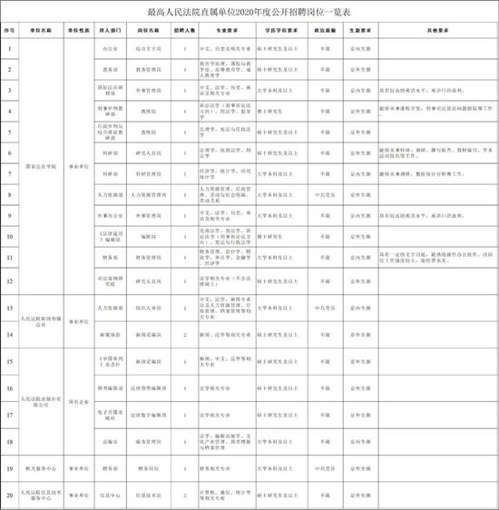招聘岗位及具体条件详见“最高人民法院直属单位2020年度公开招聘岗位一览表”