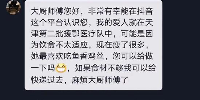 关注“大厨师傅您好,非常有幸能在抖音这个平台认识您,我的爱人就在天津第二批支援武汉的医疗队中,可能是因为饮食不太适应,现在瘦了很多,她最喜欢吃鱼香鸡丝,您可以给做一下吗?如果食材不够我可以给快递过去,麻烦大厨师傅了。”