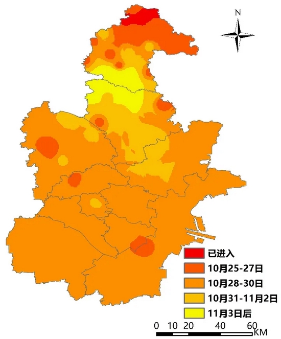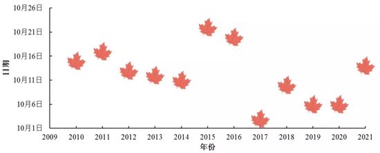 天津的红叶树种主要为火炬、黄栌、五角枫和栎树。不同树种叶片变红的时间均受气象条件的显著影响。根据中国气象局-农业农村部都市农业气象服务中心的红叶气象指数预报模型(预报因子:平均气温、最低气温、日较差及初霜日)结合红叶物候观测实况,形成2021年红叶观赏期预报结论如下: