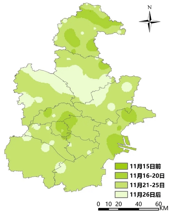 斑红-正红期(红叶比例超过60%):红叶的斑红-正红期又称红叶的最佳观赏期,最佳观赏期一般出现在初红期后的7-10天,与初红期后晴好天气条件下的阶段性降温和初霜日时间密切相关。初红期以来天津地区气温较常年偏低,光照充足,同时出现阶段性降温天气,17日初霜日后红叶变色速率迅速加快,显著缩短初红-斑红阶段的变化时间。天津大部地区红叶最佳观赏期(红叶比例超过60%)将在10月25日后陆续进入(图2),时间较常年平均略偏晚。预计2021年10月下旬至11月中旬天津市大部地区气温较常年同期略偏低,降水量较常年同期偏少,以晴好天气为主。今年天津地区的红叶最佳观赏期将会一直延续到11月中旬,11月中下旬的大风降温天气后陆续进入红叶落叶期(图3)。
