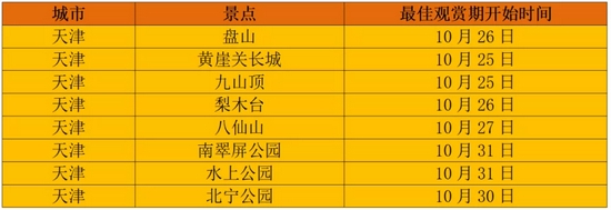 红叶的变色时间除受气象条件影响外,还与地形和海拔的差异也会导致其变色时间的不同。海拔较高的山区一般比城市公园变色速率更快。根据2021年天津市红叶观赏期的格点预报,部分景点红叶最佳观赏期预计开始时间见下图: