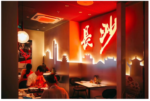 餐厅采用“活力聚场”装修风格,通过各式流行元素打造 “长沙 style” —— 黑色金属框架打造的落地玻璃橱窗,活力珊瑚红主题墙,以及特别打造的长沙城市形象灯箱背景墙,天心阁、爱晚亭、杜甫江阁、长沙国际金融中心等标志性建筑一一呈现,火红的“长沙”标识引人注目。吸引过往市民、外地游客前来餐厅用餐打卡。