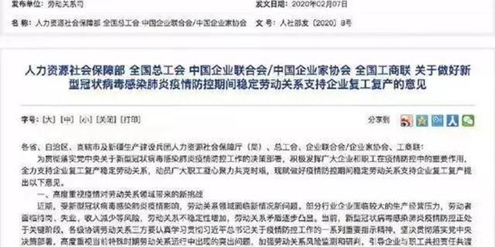 关注人社部等7日印发《关于做好新型冠状病毒感染肺炎疫情防控期间稳定劳动关系支持企业复工复产的意见》: