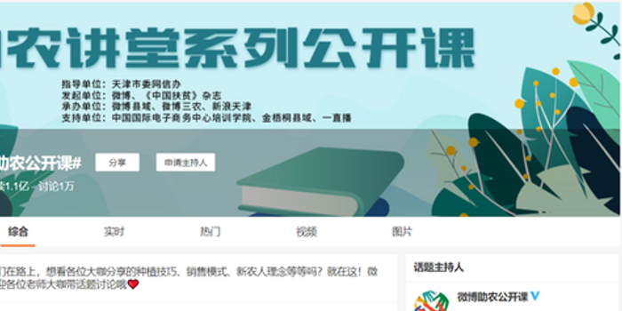 “助农公开课”活动于2月12日正式上线,由天津市委网信办指导,微博与《中国扶贫》杂志社联合发起,微博三农、微博县域和新浪天津共同承办,获得了中国国际电子商务中心培训学院、金梧桐县域等机构的大力支持,更有众多“三农”领域专家学者踊跃参与其中。2019年12月30日,由人民网天津频道、新浪天津承办的聚力融合助推网络精准扶贫暨2020年原产地探访活动在天津正式启动,而此次“助农公开课”活动作为新媒体与新农人之间联结的纽带,也成为原产地探访项目的前期预热和重要组成部分。活动期间,微博将重点向天津对口支援的贫困地区新农人进行推介。