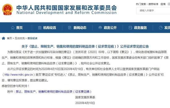 4月10日,国家发改委发布关于《禁止、限制生产、销售和使用的塑料制品目录(征求意见稿)》公开征求意见。