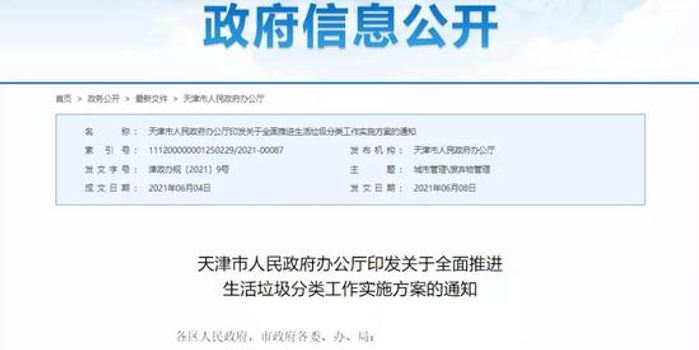 关注日前,关于全面推进生活垃圾分类工作的实施方案在天津政务网发布。