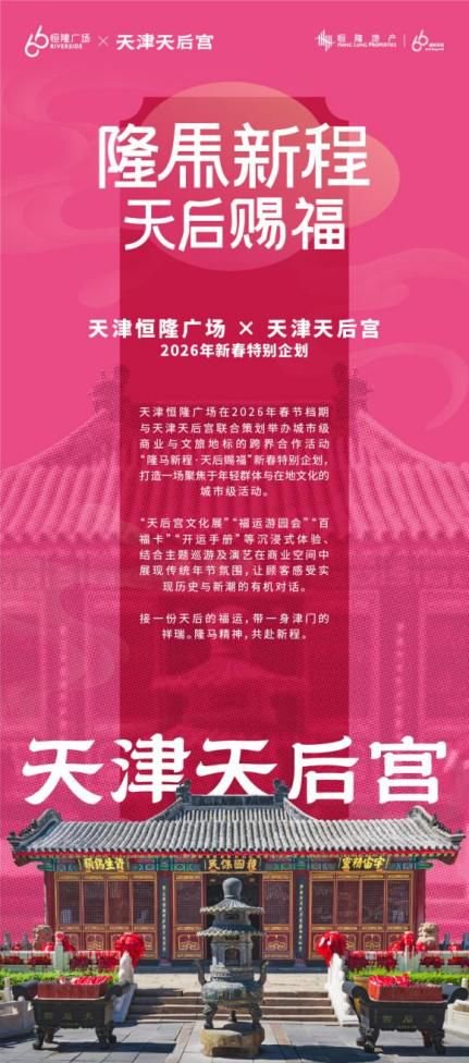 关注今年是恒隆成立66周年,恒隆以“66成就无限”为主题,拉开66周年庆典序幕。作为首场庆祝活动,即日起至3月3日,全国八城十座恒隆广场联动,盛大开启“隆马新程”新春主题活动,以焕新姿态迎接新岁到来。天津恒隆广场以商业新场景激发文旅新动能,在春节档期首次跨界联动天津天后宫,将传统年俗与摩登美学深度融合,以多元精彩体验共启新春华章。