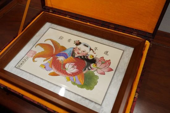 好物介绍:莲年有余”可谓杨柳青年画之经典代表作,图中娃娃手持莲花,怀抱金鱼,有莲“连”有鱼“余”,谐音寓意连年有余,表达人们企盼富裕美好生活的愿望。