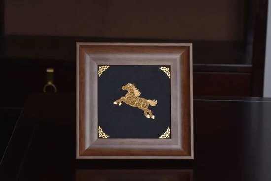 好物介绍:这款马年相框以非遗花丝工艺,以铜丝雕琢镀金奔马,融传统生肖文化与古法技艺于一体。镂空花丝勾勒的奔马昂首腾跃,既诠释“马到成功”的美好祈愿,又借骏马象征的活力奋进,契合马年锐意进取的期许。实木相框配鎏金缠枝角花,黑底衬金尽显华贵,既是中式家居陈设佳选,也是传递“龙马精神”的马年礼赠上品。
