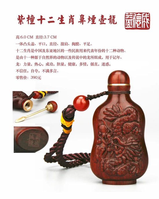 好物介绍:益德成的紫檀鼻烟壶选用非洲紫檀木,它是一种蝶形花科,紫檀属的树木,其木质坚硬致密,易于雕刻。紫檀十二生肖鼻烟壶是一款融合非遗技艺与传统文化的精致工艺品,以名贵紫檀木为材,结合十二生肖元素雕刻而成,兼具收藏价值、文化寓意与实用功能,适合作为礼品或个人雅玩。