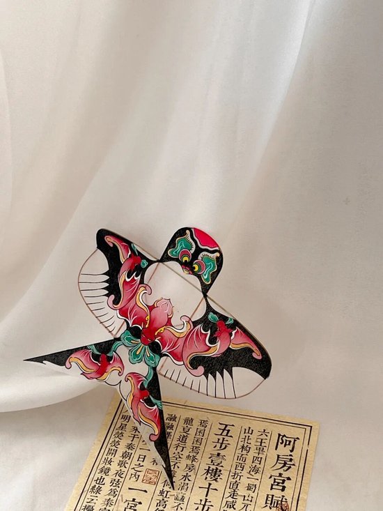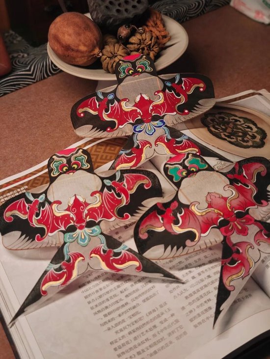 好物介绍:该微型硬翅风筝采用传统沙燕架型,使用南竹扎架、丝绸绘制的方法进行制作。图案为原创设计的“蝙蝠衔飘带纹样”,怀中一蝠聚福心,四蝠展翼守四方,取“五福捧寿”的吉祥之意。飘带既成视觉纽带,寓示福运随鸢升空,圆满天成。风筝尺寸(15*15cm)十分适合亲朋馈赠、家具装饰、美学陈设之用。