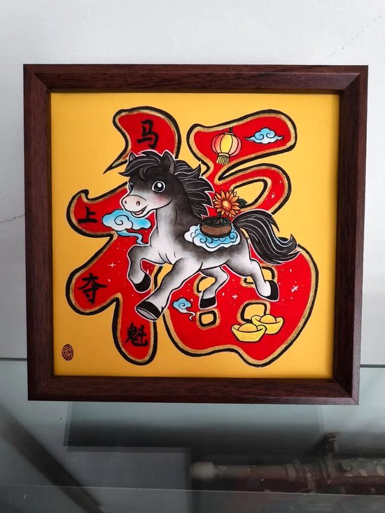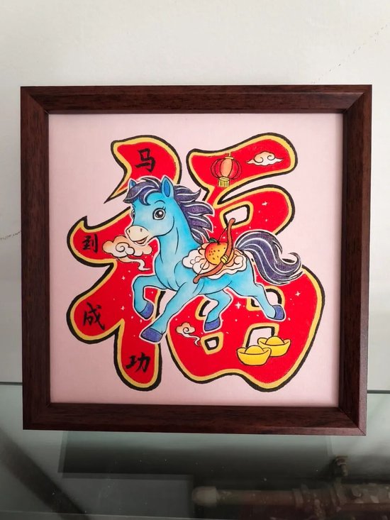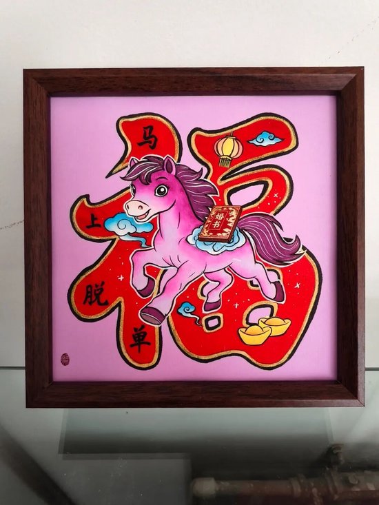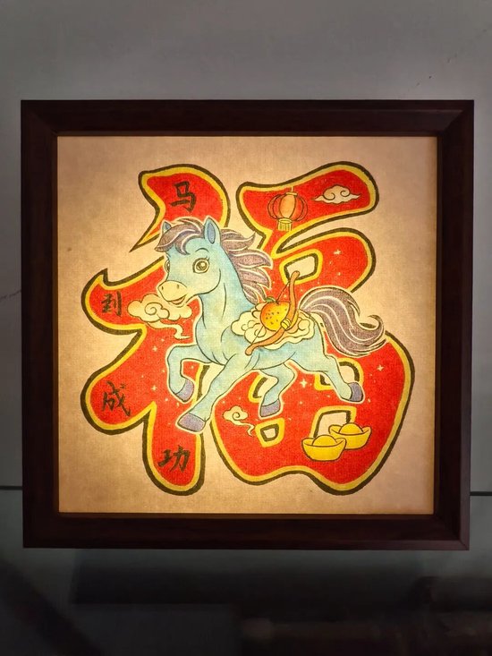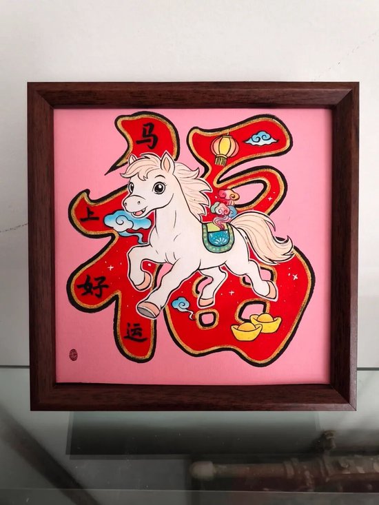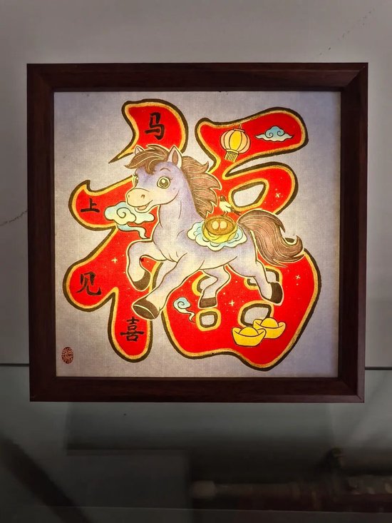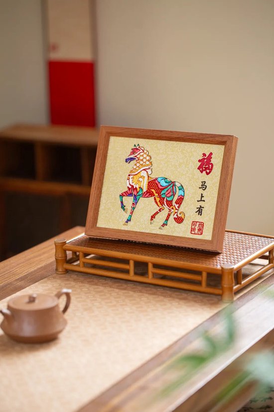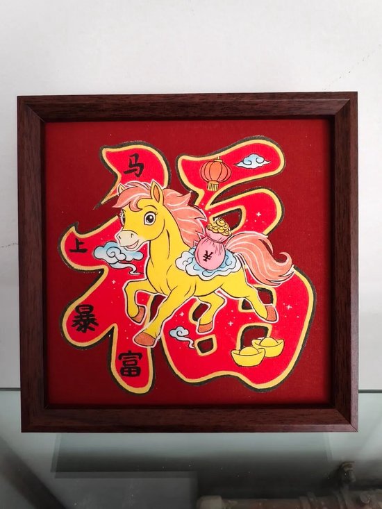 好物介绍:此作品是在处理好的织锦缎上绘制出马的图案,然后沿轮廓剪刻出顺滑的线条,再经装裱制作而成。此作品选用的织锦缎颜色鲜艳,图案丰富,节日氛围拉满,由于花色随机,每一件作品都是独一无二的。可定制文字,是一件轻巧精致,礼送友人,装点家居的非遗好物。