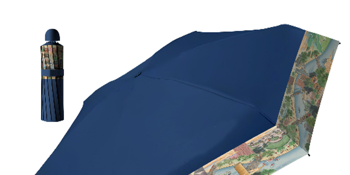 好物介绍:“开合之间,晴雨皆有乾坤”一一天津杨柳青年画《海河绘》主题纪念晴雨伞。这是一把轻便遮阳五折伞。伞面底色沿用了上合峰会logo的蓝色系,图案是描绘天津海河风貌的杨柳青年画《海河绘》,伞底印有作品名称和动态展示二维码,手机扫码即可欣赏动画版《海河绘》,开合之间给人内有乾坤的感觉,独具天津特色。