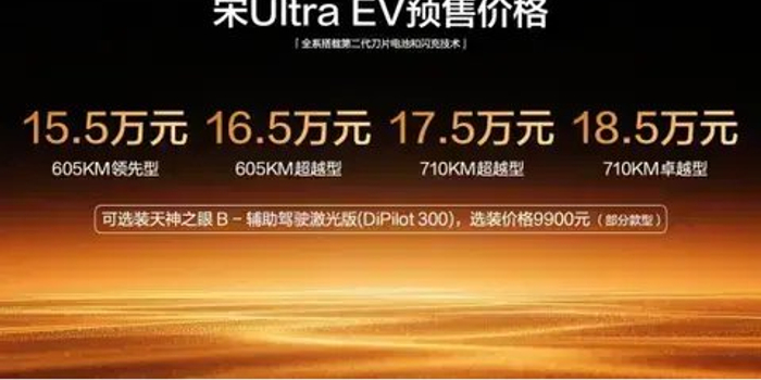 此次宋Ultra EV共推出四款配置车型,605KM领先型15.5万元、605KM超越型16.5万元、710KM超越型17.5万元、710KM卓越型18.5万元,部分款型还可选择加装天神之眼B-辅助驾驶激光版(DiPilot300),选装价仅9900元,让高阶智能驾驶体验触手可及。为回馈首批预订用户,比亚迪还推出了涵盖闪充、金融、置换、车色等多维度的重磅预售权益,且所有权益均面向2026年3月5日预售启动至上市当日24:00间,通过比亚迪APP/小程序成功下订,并在2026年6月30日前完成购车开票的用户,诚意拉满。